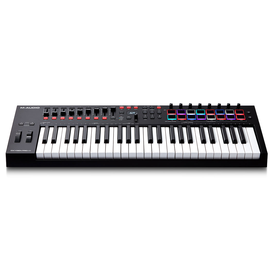 Fusing 49 best-in-class, velocity-sensitive, semi-weighted keys with aftertouch and assignable zones with a built in arpeggiator, 16 RGB, backlit, assignable, velocity-sensitive pads with Note Repeat, 8 assignable knobs and 9 assignable faders, Oxygen Pro 49 comes complete with everything you need to get the most out of your virtual instrument collection and DAW.