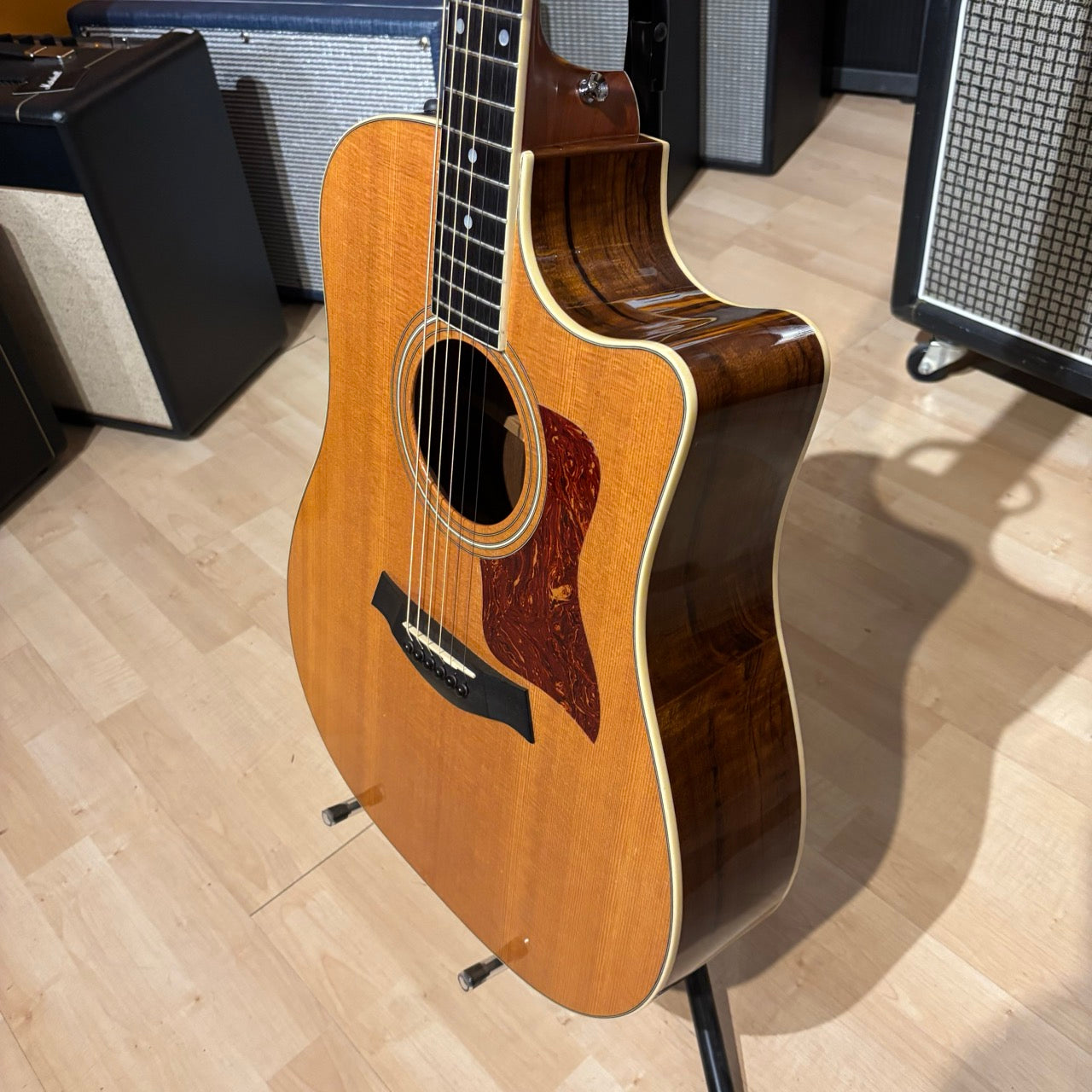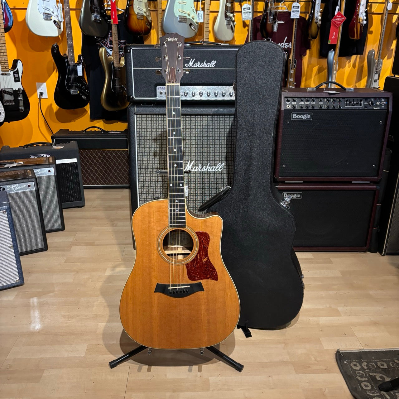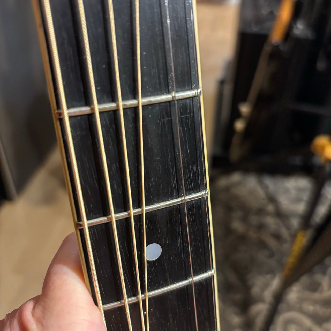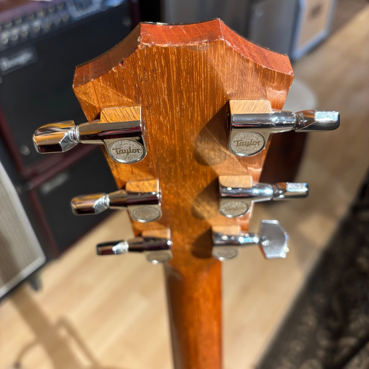 This used, and very recently traded in , One owner Taylor 410ce-L1 is a classic dreadnought acoustic-electric featuring a Sitka Spruce top with Ovangkol back & sides, a mahogany neck with an ebony fingerboard with progressive dots inlays, Venetian cutaway, and Taylor's Expression System (ES-1) electronics, known for its balanced tone and reliable playability, this is an excellent playing guitar that sounds absolutely wonderful whether plugged in, or just strumming away acoustically. Very nicely played in with super rich and tight sounding low-mids, and bright glass-like high tones. Clearly a daily player for the one original past owner and very well cared for with no cracks anywhere on the guitar and no history of past repairs of any kind. However there are a few rather minor finish issues with regards to the face of the headstock area where as the lacquer has a few finishing flaws and chipping marks located just below each of the machine head post's,..as well as the very top- Face plate of the headstock itself. All of these discribed issues can be clearly seen in the posted pics. Also I should point out that the frets are all still quite fresh and recently dressed up with lots of meat left on them all. Great player that has seen some use and as a result of constant playing,..sounds absolutely wonderfull !!