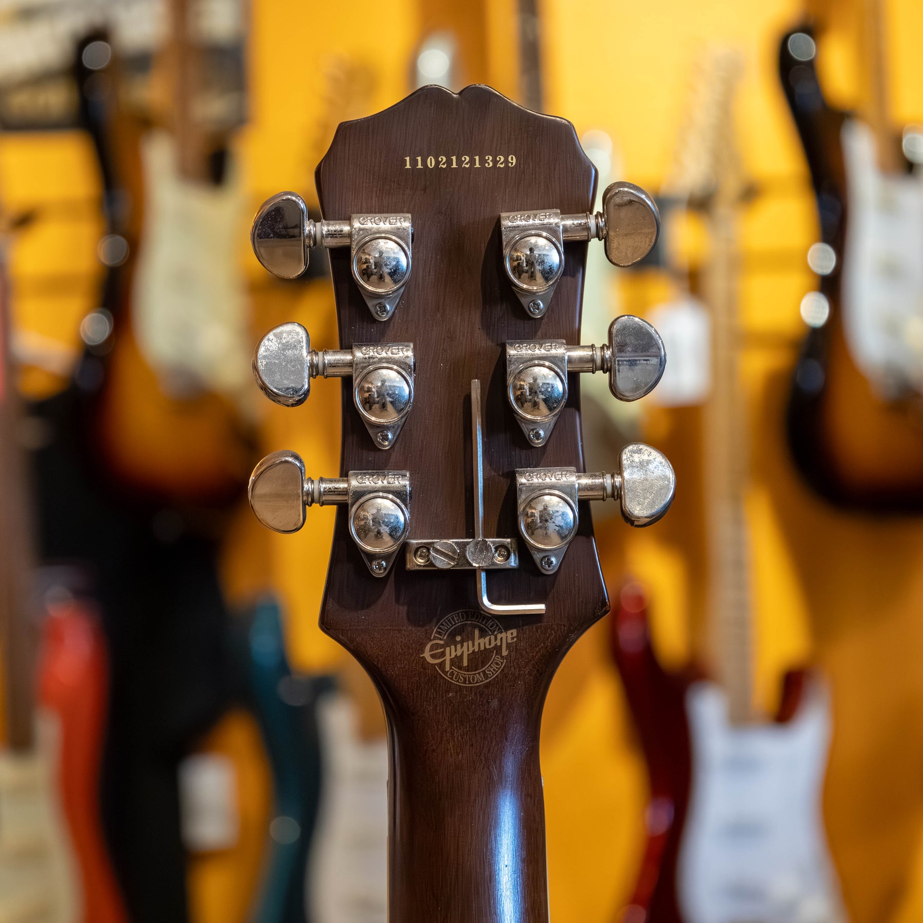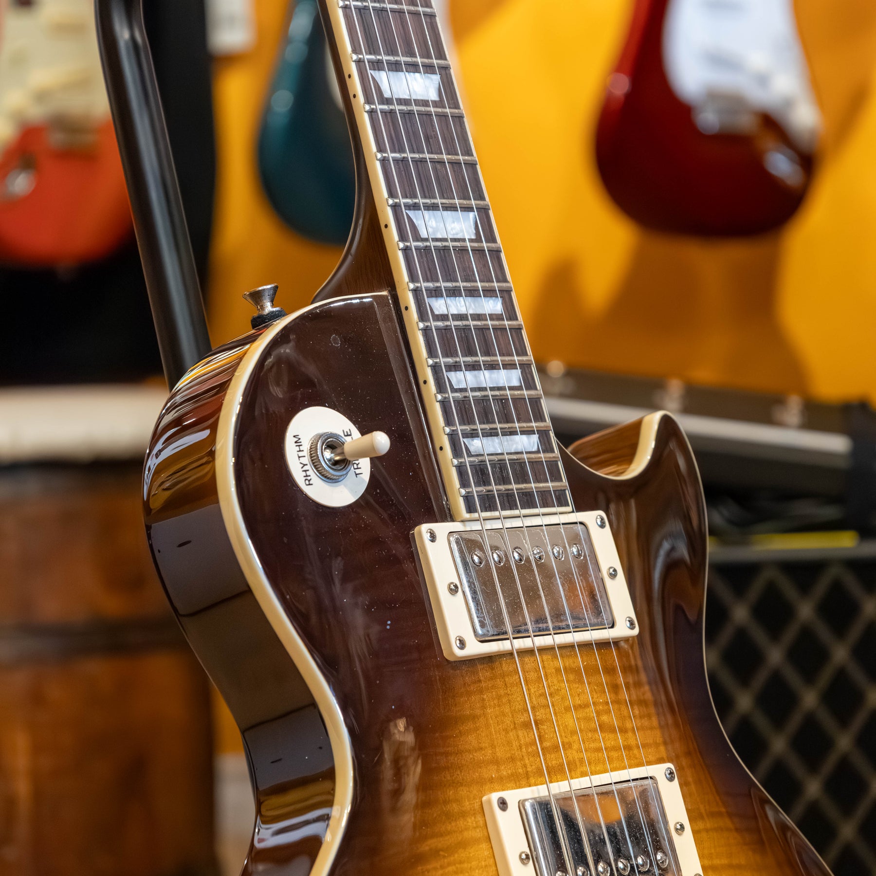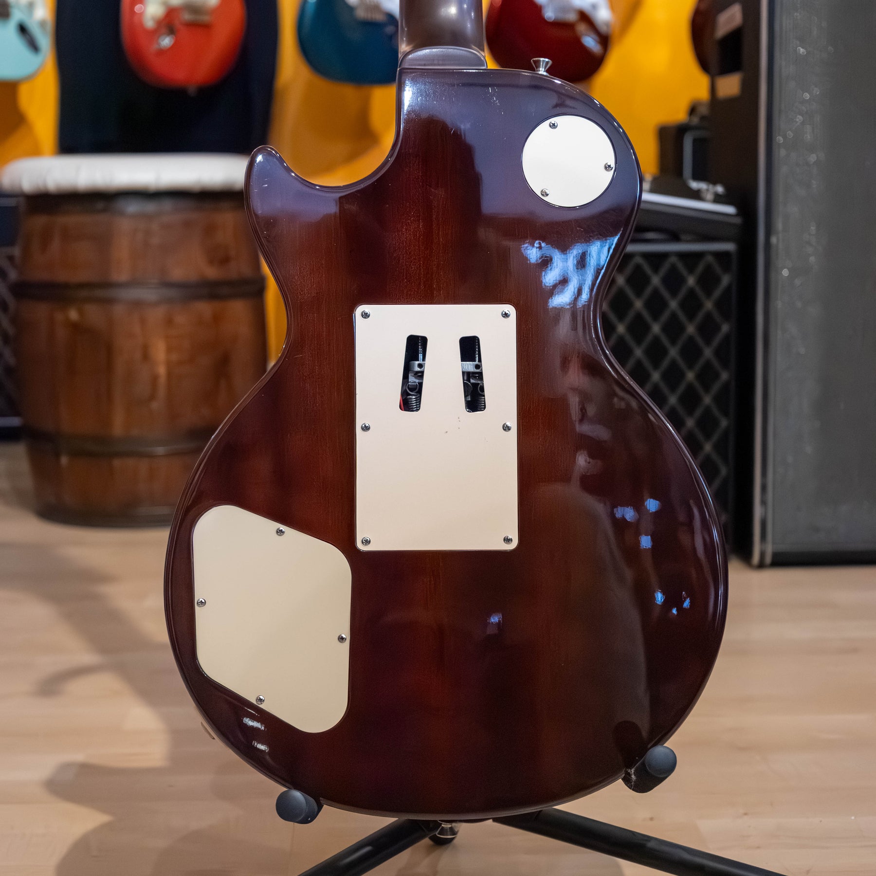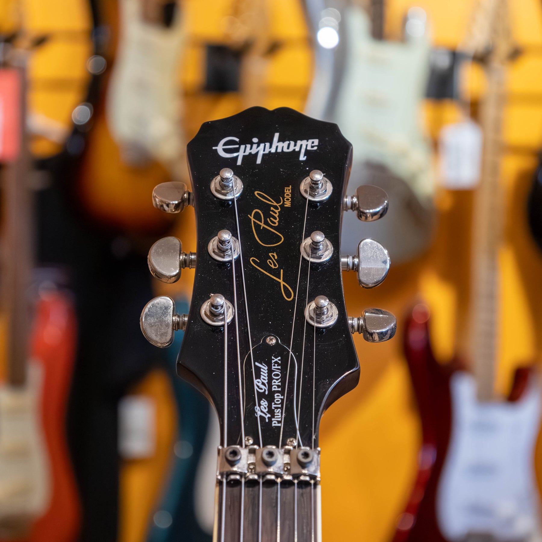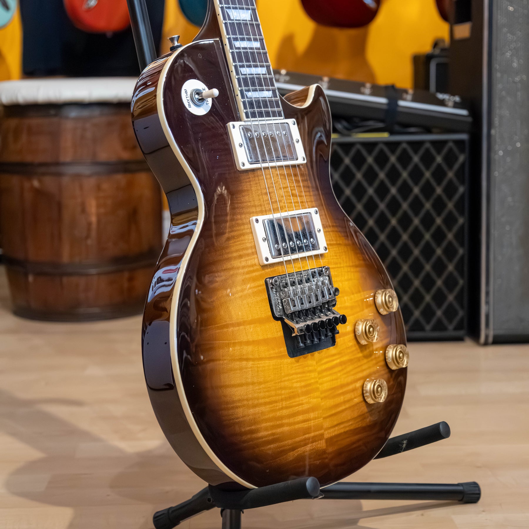 USED 2011 Epiphone "PRO FX" Les Paul Standard "Plus top" with factory installed "Floyd Rose Special" tremolo system. Excellent condition with olny one very small ding on the back of the guitar located beside the upper strap pin. Flame maple plus graded top with a tobacco burst - high gloss finish and all its original Epiphone installed parts. Aside from the one small chip, the guitar is in 100% flawless condition,.. and from the looks of the thing, it's a total case queen!! Alnico Classic humbuckers with coil split- taps. Slim taper "D" shapped solid mahogany neck with Grover 3&3 nickel NON licking tuners. Complete with its original hang tags and includes a black with black interior and slip cover Gibson hard shell case. Also has the added bonus of a professionally installed "Tremol-NO" floyd trem block kit. Re-strung and set up with a fresh set of Ernie Ball REG slinky 10-46 gauge strings.