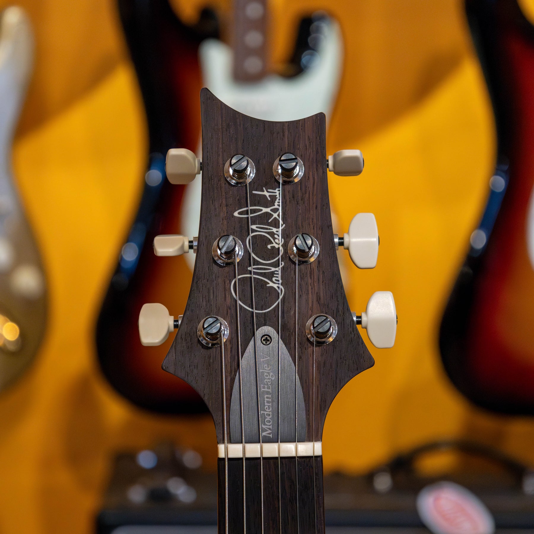 The Modern Eagle V is an innovative instrument that offers highly musical tones for both recording and playing live. Utilizing a hum/single/hum (five-coil) pickup layout and unique electronics configuration, the Modern Eagle V gives players a vast array of tones in one guitar. The 5-way blade switch selects the pickups in intuitive groupings: treble, treble and middle, middle, middle and bass, and bass. There is a single volume and a push/pull tone control that activates both humbuckers when engaged; this allows players to access all three pickups simultaneously. Finally, the mini toggles allow players to individually tap the humbucker coils, for additional single-coil sounds. This electronics design puts a whole set of classic and new tones at your fingertips.
