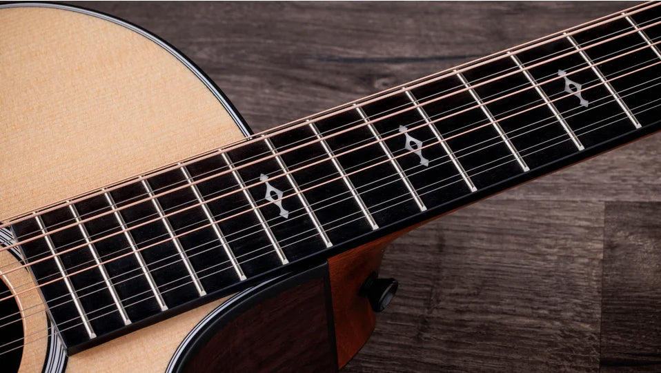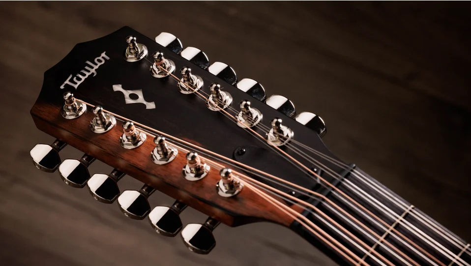 Taylor’s patented V-Class bracing improves sustain, volume and pitch accuracy by controlling how the soundboard vibrates along and across the strings. On a 12-string instrument, this results in cleaner octave alignment, improved harmonic cohesion and a more unified response across the neck. Chords ring out evenly with enhanced sustain, while single-note lines retain clarity and definition higher up the fretboard.