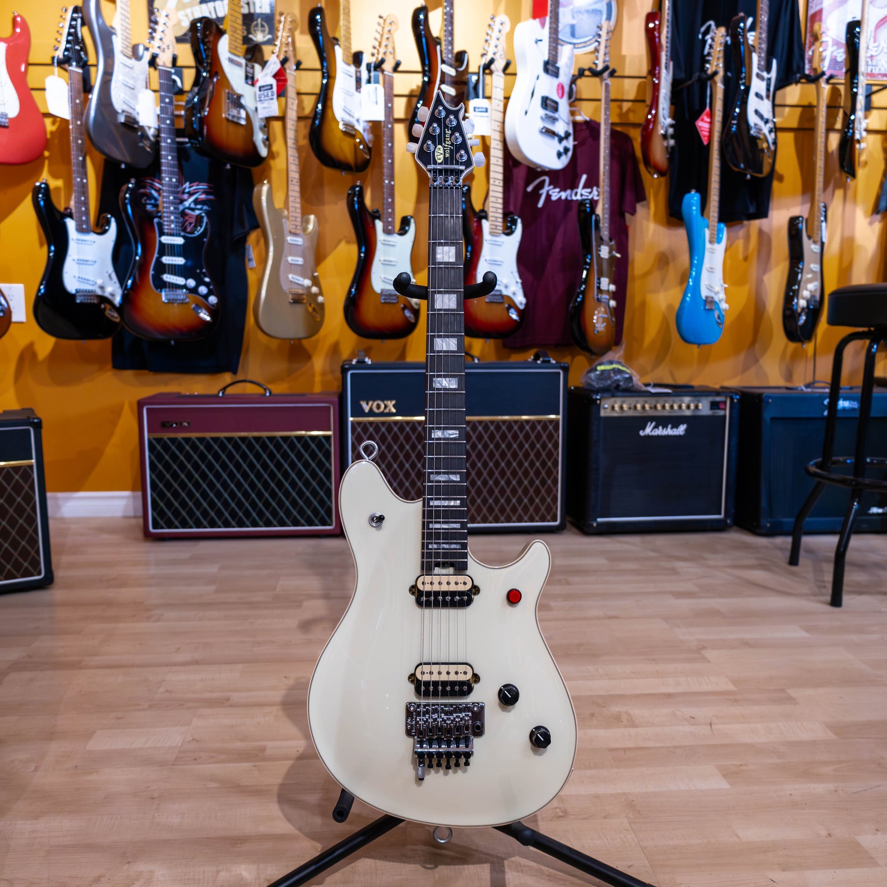 Boasts elegant and classic style in Ivory or Stealth finishes with chrome hardware, black speed knobs and dog leash strap/eye-bolt clasps. A hardshell EVH Striped SKB case and EVH leather strap included.