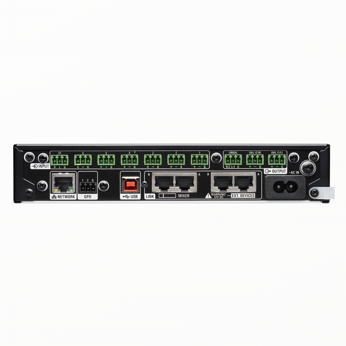 The mixer is equipped with six balanced Mic/Line inputs and one unbalanced stereo input, along with two balanced and one unbalanced stereo outputs. Network (Cat5e or better) and USB ports are also included, as are A/B Audio-Technica Link ports that let users connect eight mixers sharing audio buses and SmartMix controls via Cat5e cable for simultaneous use within an expanded setup.