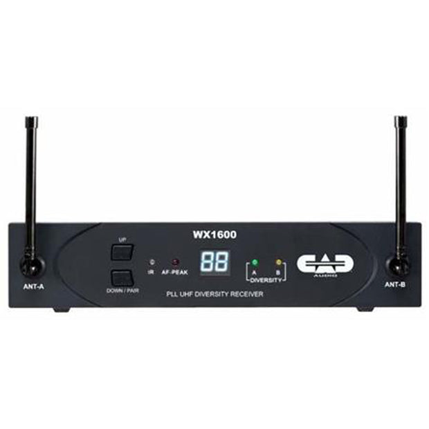 The WX1600 UHF 100-Channel Frequency Agile Handheld Wireless System from CAD Audio is for capturing audio. It is used in various venues for vocal and speech applications such as for singers, public speakers, stage and theater performances and more. It features a frequency response of 40Hz to 15kHz and a dynamic range of 109dB. This handheld system features 100-channel UHF frequency agile reception and offers connectivity with a minimal of multipath interference. The WX1600 is built with Scan-Link technology to provide instantaneous and automatic channel configuration. There is an automatic code encoded squelch to help prevent and eliminate unauthorized interference. AA batteries supply over 15 hours of battery life. The transmitters have SoftTouch On and Mute switches with multicolor LED indicators to monitor mute status and battery life. The receiver is built with a metal chassis to provide a durable and shielded enclosure. This receiver features 1/4" and XLR outputs to connect to a mixer source. Rack ears and joining kit are included.Music City Canada is an authorized reseller for CAD products. Purchases are backed with full manufacturer warranty in Canada. All orders ship from our Canadian warehouse.
