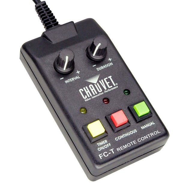 The FC-T is a remote control designed to work with most CHAUVET fog machines. Three LED indicators display timer on/off, continuous fog on/off and whether the machine is ready or heating. Two rotary knobs set interval and duration times.