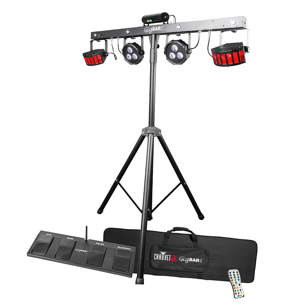 This LED DJ lighting system includes four of the most popular lighting fixture types into one control bar system. The Gig Bar features 2x Derby-style effect lights, 2x LED par lights, 4x strobe diodes and 1x laser light!The Gig Bar IRC features phenomenal built-in automated and sound-activated programs that include all 4 effects to make one complete dynamic show for any event. Easily control the Gig Bar IRC from the display, IRC-6 remote control, wireless footswitch or DMX to take your gig to a higher level.