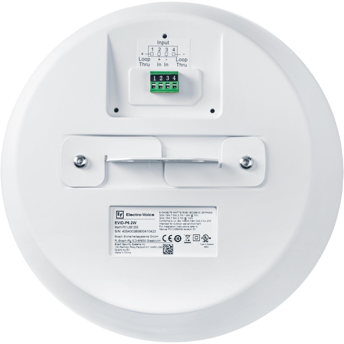 Each speaker is equipped with a line-matching transformer for 70V/100V operation, and a transformer tap-selector switch that includes 8-Ohm bypass operation, conveniently located on the front of the speaker. The EVID-P6.2 provides wide dispersion, high-efficiency, high-maximum output, ease of installation, and wide-range reproduction of music or voice.