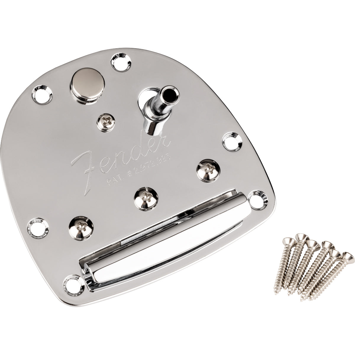 Chrome-plated steel tremolo plate with stop tailpiece. "Fender" and "Pat # 2972923" are stamped into the plate. Assembly also includes tremolo lock button and tremolo arm bushing.
