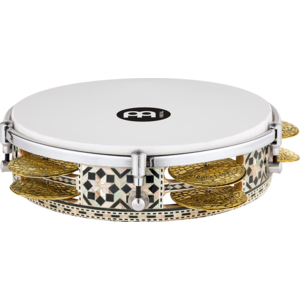 Outstanding traditional sounds and looks from the MEINL Percussion Artisan Edition Riq Drum comes with effortless touch. Rooted in Arabic folk and classical music, this drum features ten pairs of rich and cutting brass jingles with a special textured finish. The wood shell is finished in an exquisite white burl mosaic royale motif. A synthetic 8 3/4" head is secured with five tuning lugs and a lightweight aluminum rim. This head has a wide dynamic range and can support the high-tension tunings Riqs are typically played with. Doum and tak strokes, as well as finger rolls, resound with beautiful overtones from the head and jingles. Tuning key included